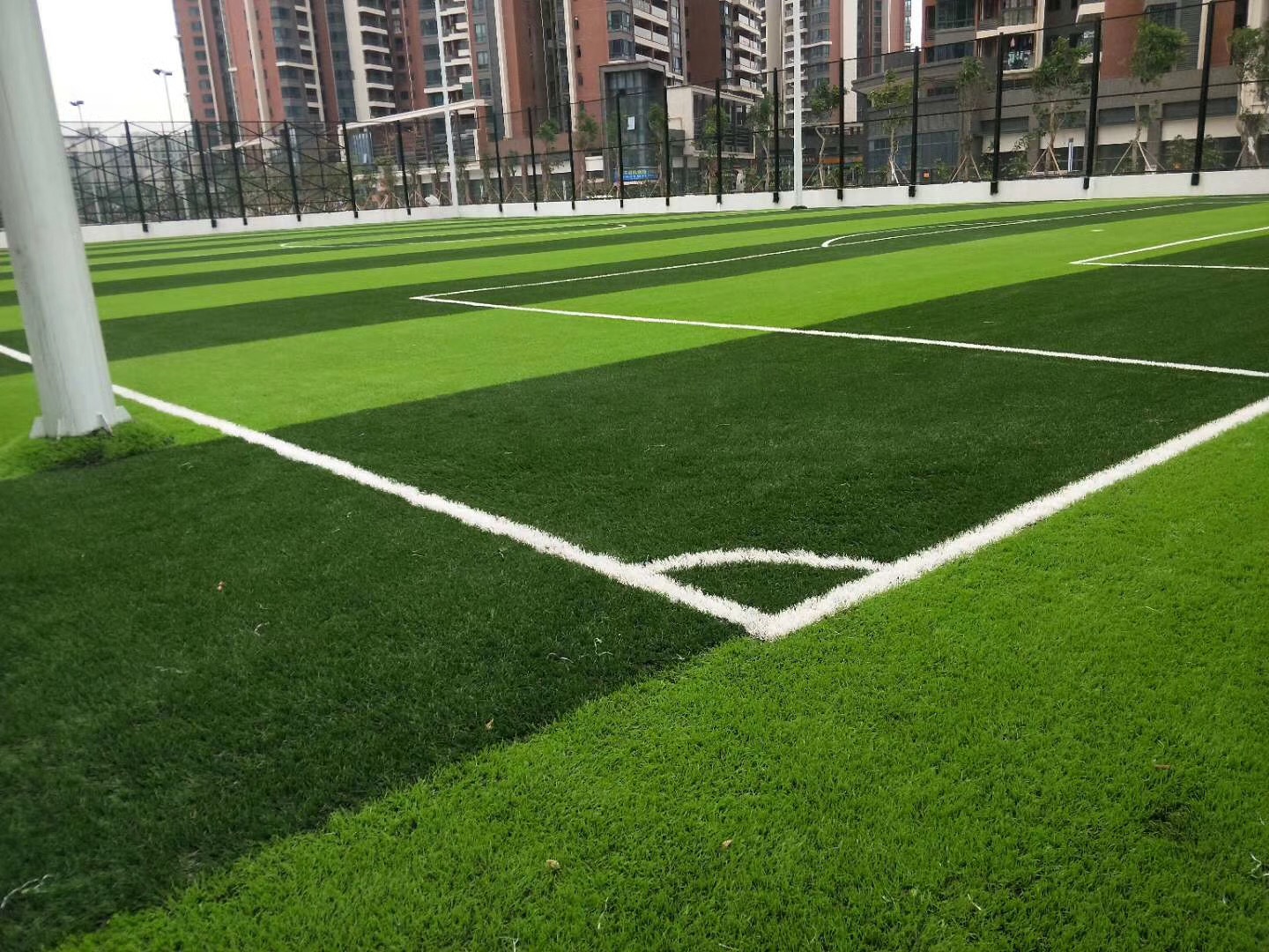 中山市華發(fā)城建未來(lái)薈4500平的兩個(gè)足球場(chǎng),這款是綠達(dá)LDZ800的足球草,8000磅重的,密度16800,草高50mm,顏色深綠+果綠,底布PP+網(wǎng)格,卷長(zhǎng)根據(jù)場(chǎng)地尺寸量身定做。