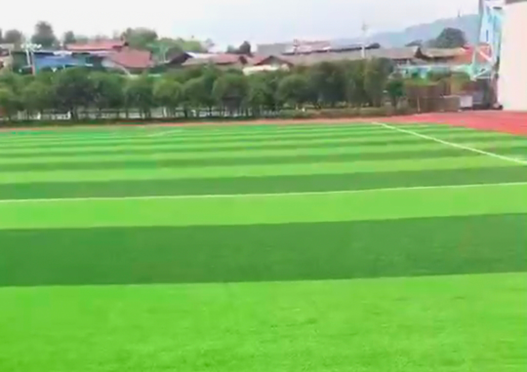 河南省新鄉(xiāng)市延津縣某小學足球場選用的是綠達LDMZ140(免充砂足球草),這款草的分特數(shù)14000,草高30mm,密度21000,顏色深綠+果綠,底布PP+網(wǎng)格。